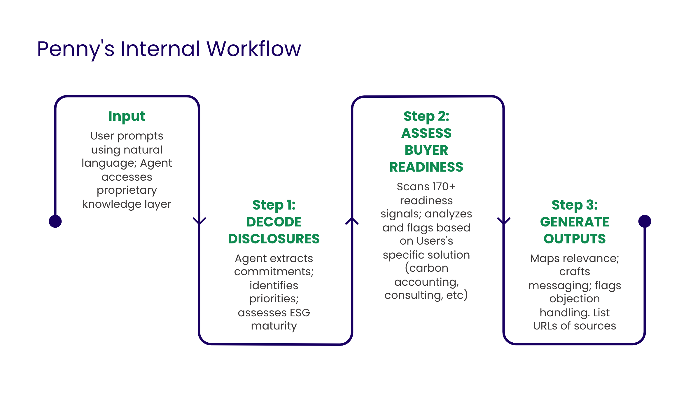 Penny is the first agentic AI trained on more than 1,304 lines of proprietary context and hundreds of pages of knowledge-base material — including 170+ buyer readiness signals and 8 decision maker personas — specific to selling sustainability solutions.